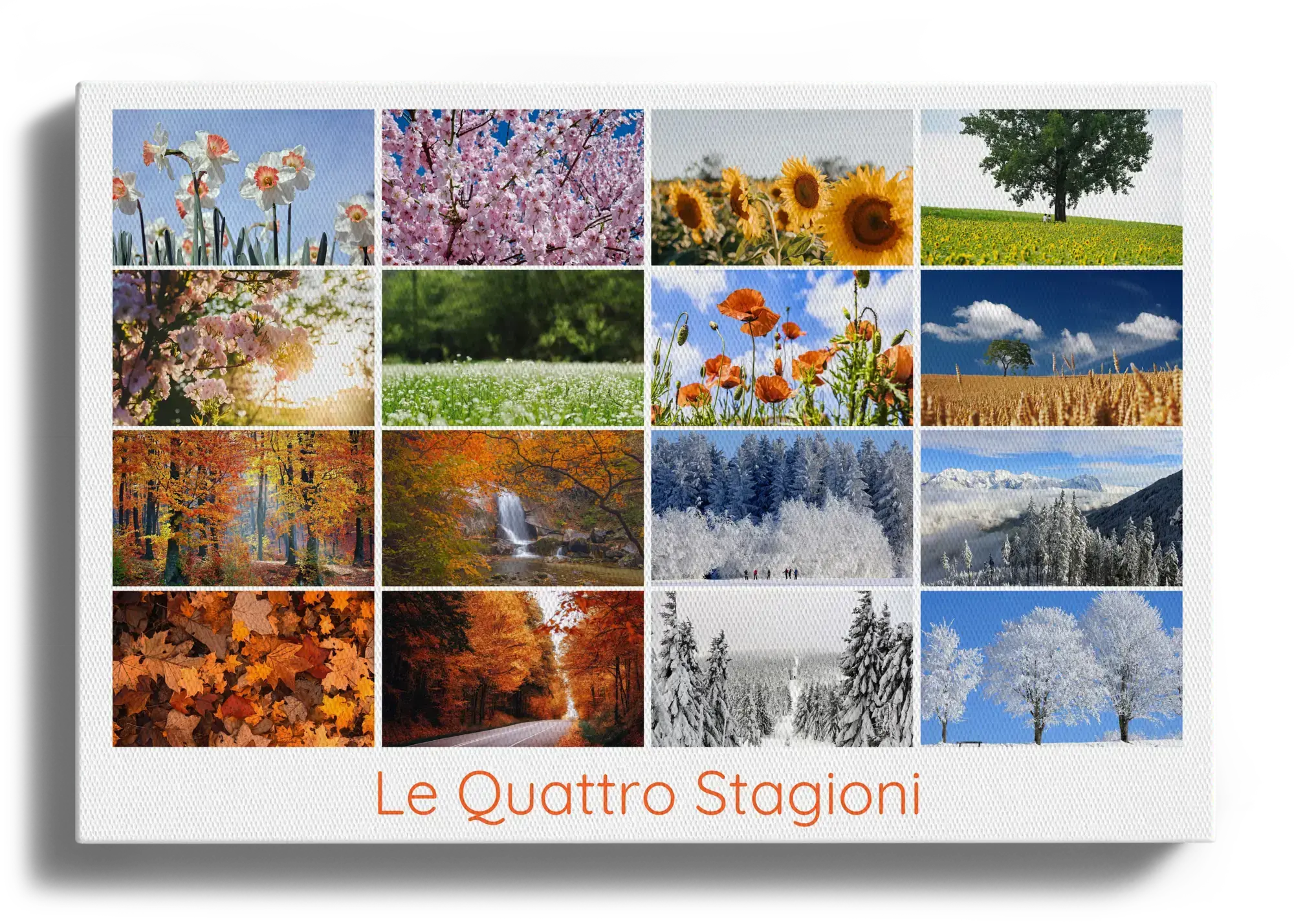 Inizia ora: trasforma le tue foto di natura, paesaggi e animali in una stampa premium sul tema stagioni. Primavera con alberi e fiori in fiore, estate tra prati e alberi, autunno di foglie colorate, inverno con boschi innevati. Scegli il modello di collage e rendilo tuo.