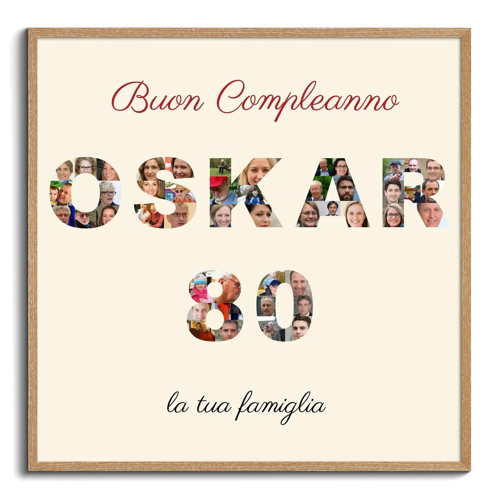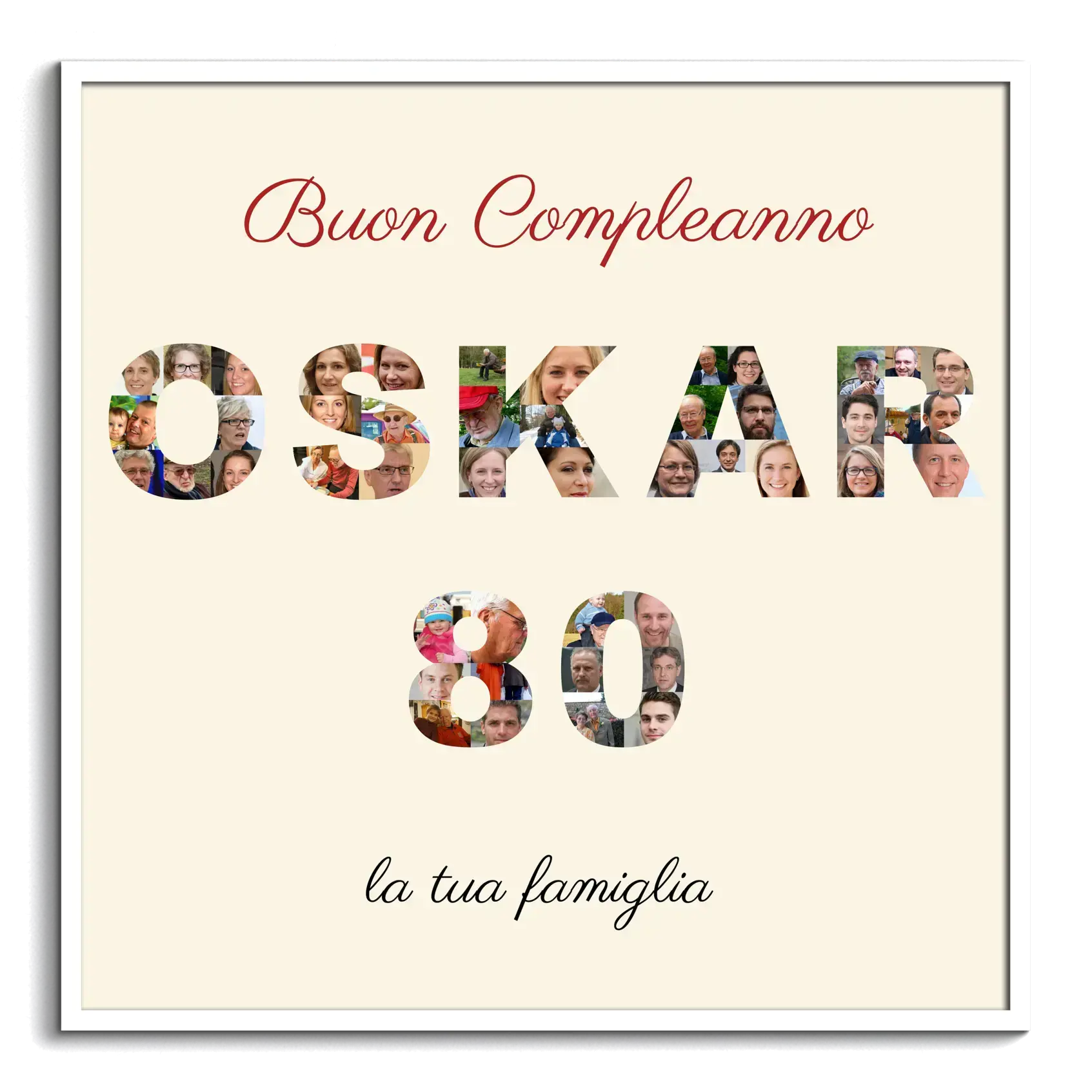 Creare una fotocollage personalizzata non è mai stato così facile! Con questo esempio di prodotto, puoi creare una splendida composizione in cui le tue foto sono disposte per formare un testo multiriga. L’esempio mostra un nome e il numero "80" realizzati con tante piccole fotografie, insieme a frasi personalizzabili come "Tanti auguri, dalla tua famiglia". Perfetto come regalo unico o decorazione speciale per una festa di compleanno.