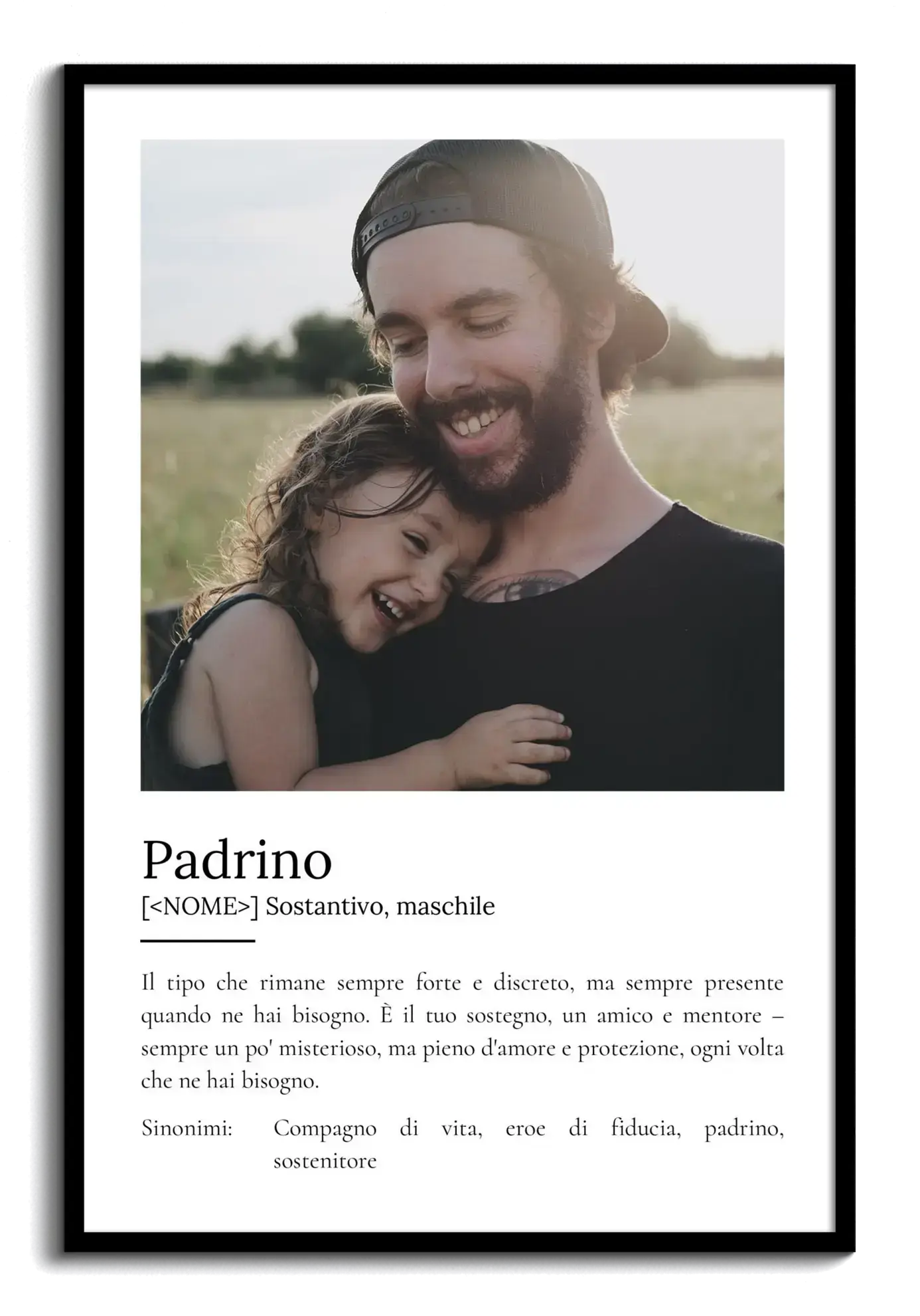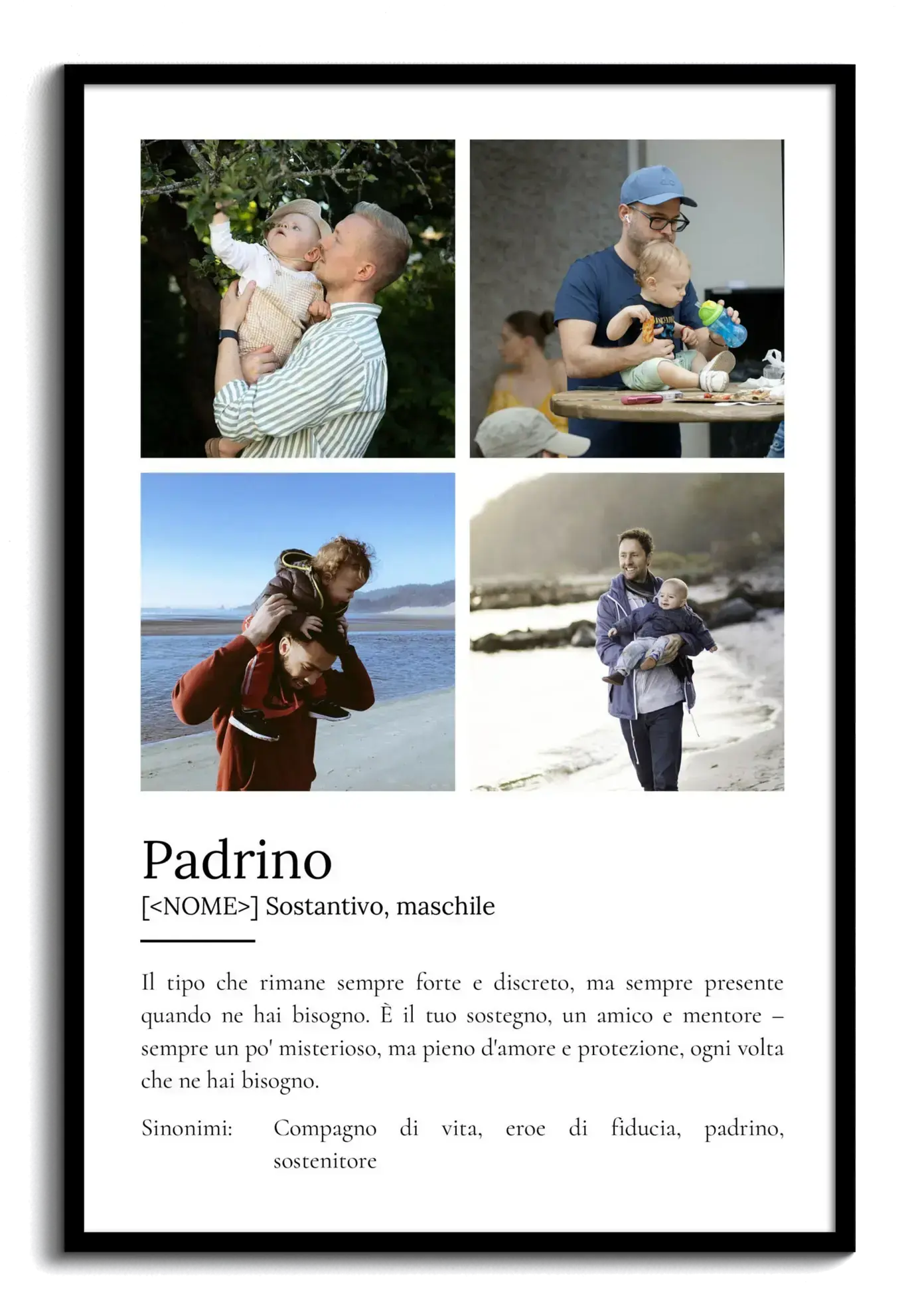 Crea il tuo poster personalizzato per un Padrino e rendi questo regalo unico e speciale. Scegli fino a 9 foto e personalizza il testo, come la bellissima definizione che descrive un Padrino come colui che c'è sempre quando ne hai bisogno, un mentore amorevole e protettivo. Inizia ora a creare un collage indimenticabile.