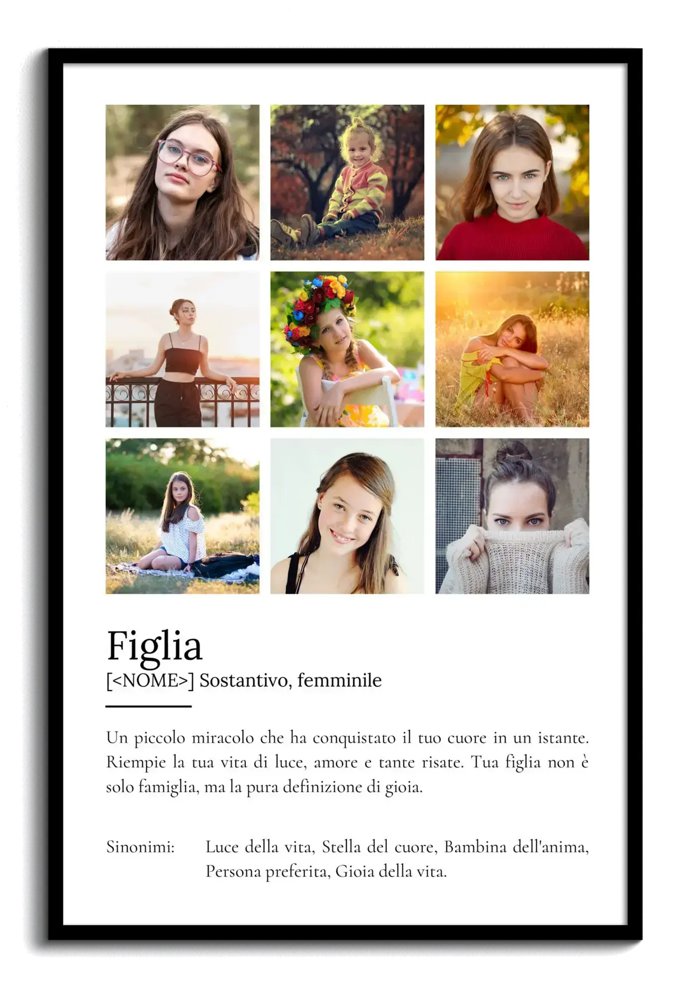 Crea il tuo poster personalizzato con la nostra fotocollage speciale che celebra il legame unico con tua figlia. Immagina un regalo che unisce fino a nove delle tue foto più preziose con un testo che esprima perfettamente ciò che lei rappresenta: una piccola meraviglia che illumina la tua vita con amore e risate.