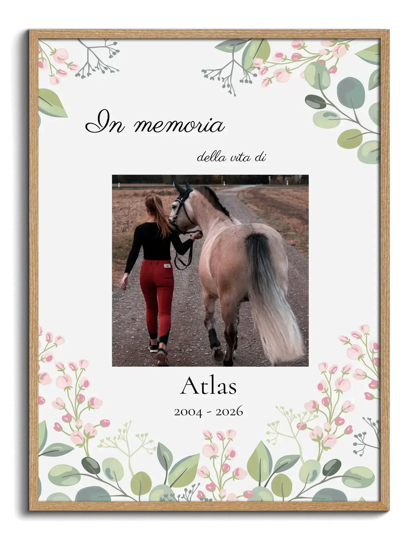 Poster commemorativo per cavalli: foto, nome e date. Sobrio, dignitoso, personalizzabile.