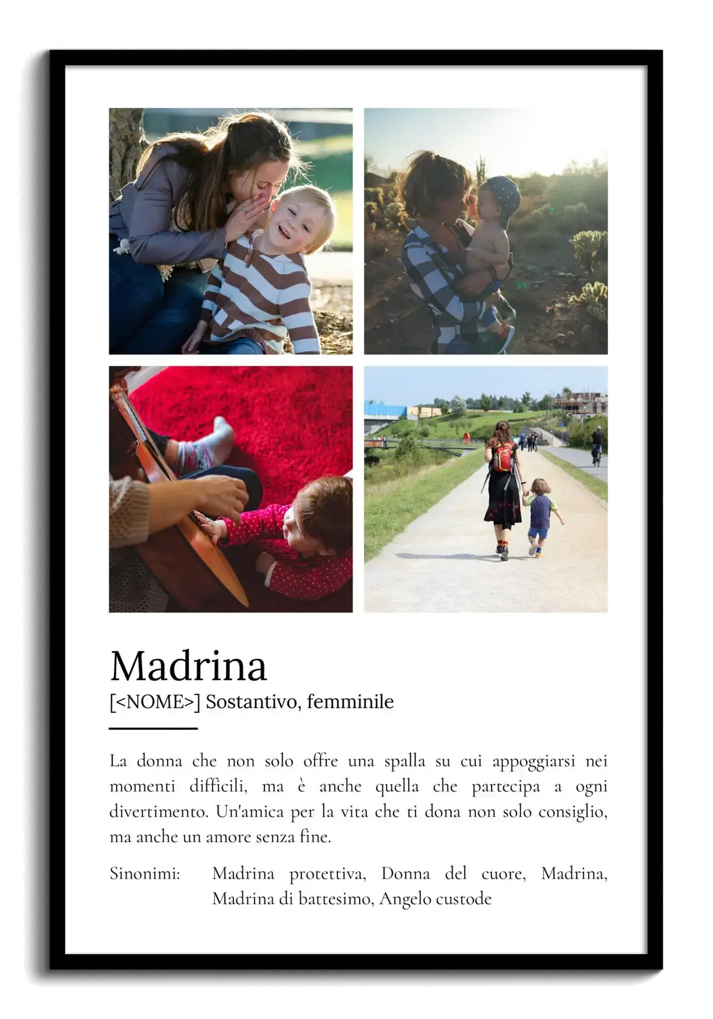 Crea la tua fotocollage personalizzata e sorprendi la tua madrina con un regalo unico e significativo. Immagina un poster definizione "Madrina" in stile dizionario, con spazio per caricare fino a 9 foto personalizzate. Il testo può essere adattato alle tue esigenze: "La donna che non solo offre una spalla su cui appoggiarsi nei momenti di crisi, ma è anche colei che partecipa a ogni divertimento. Un'amica per la vita, che ti dona non solo consigli, ma anche amore infinito."